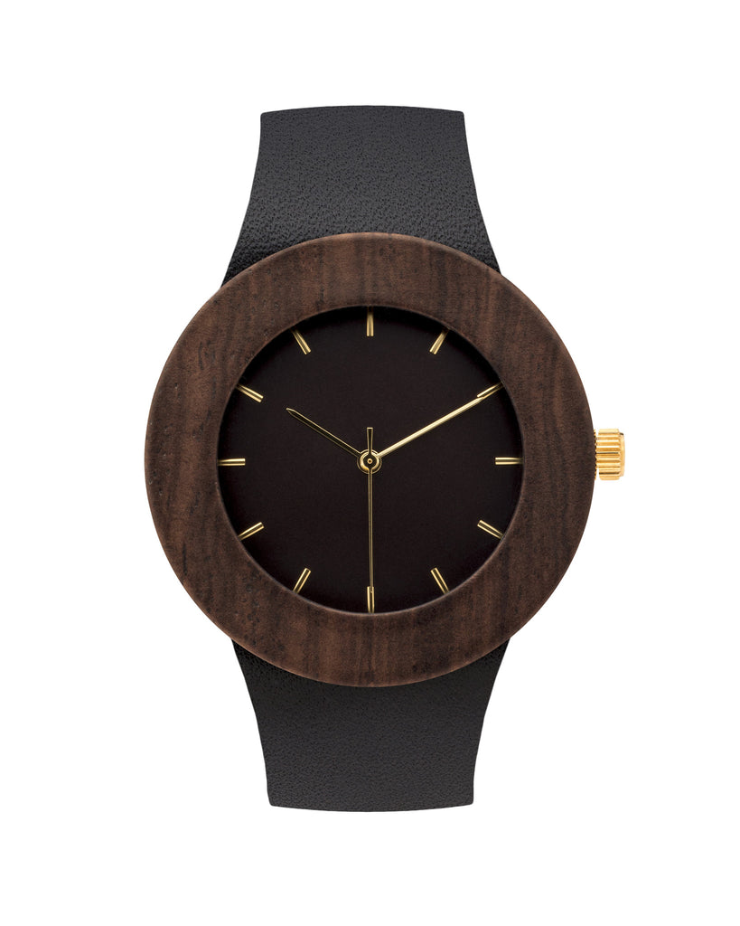 The Leather & Blackwood design comes with gold finishing, and is outfitted with a precise Japanese quartz movement. The body is light weight and perfectly proportioned for long lasting comfort.