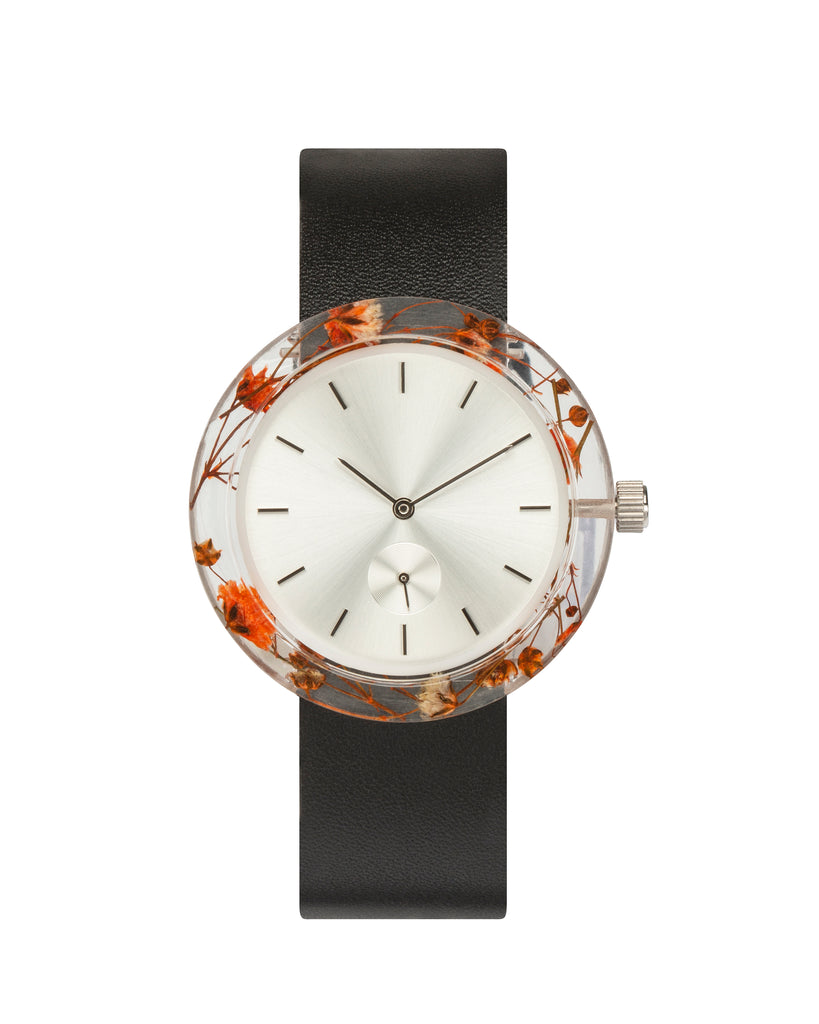 The Orange Baby's Breath Botanist Watch, features a brushed silver sunray dial and chronograph second-hand. It is designed for the understated minimalist - stylish, light weight, and design driven.