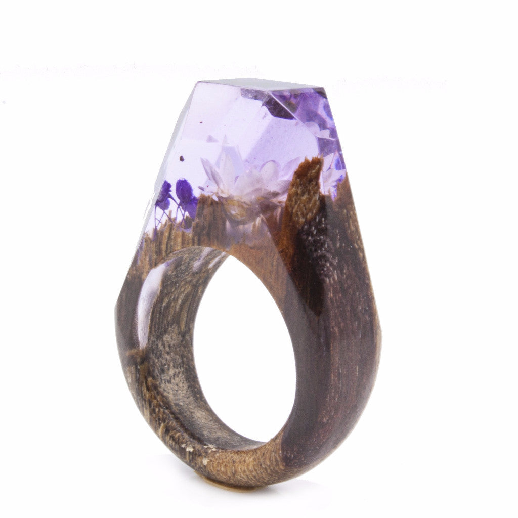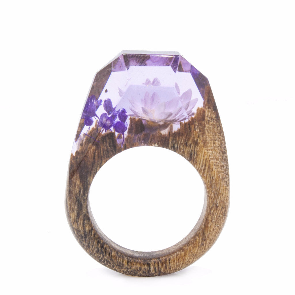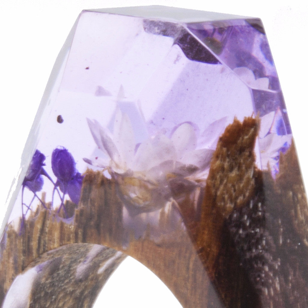 Our Botanist rings are each hand crafted, in limited quantities, with all natural flowers and plant life. Each miniature world is a forever preserved wearable work of art you can keep close to you everyday. These reminders of nature are carefully hand cast, cut, finished, and go through an intensive polishing process giving them an unparalleled level of clarity. Each wood, flower, and plant detail is hand placed resulting in no two identical scenes.