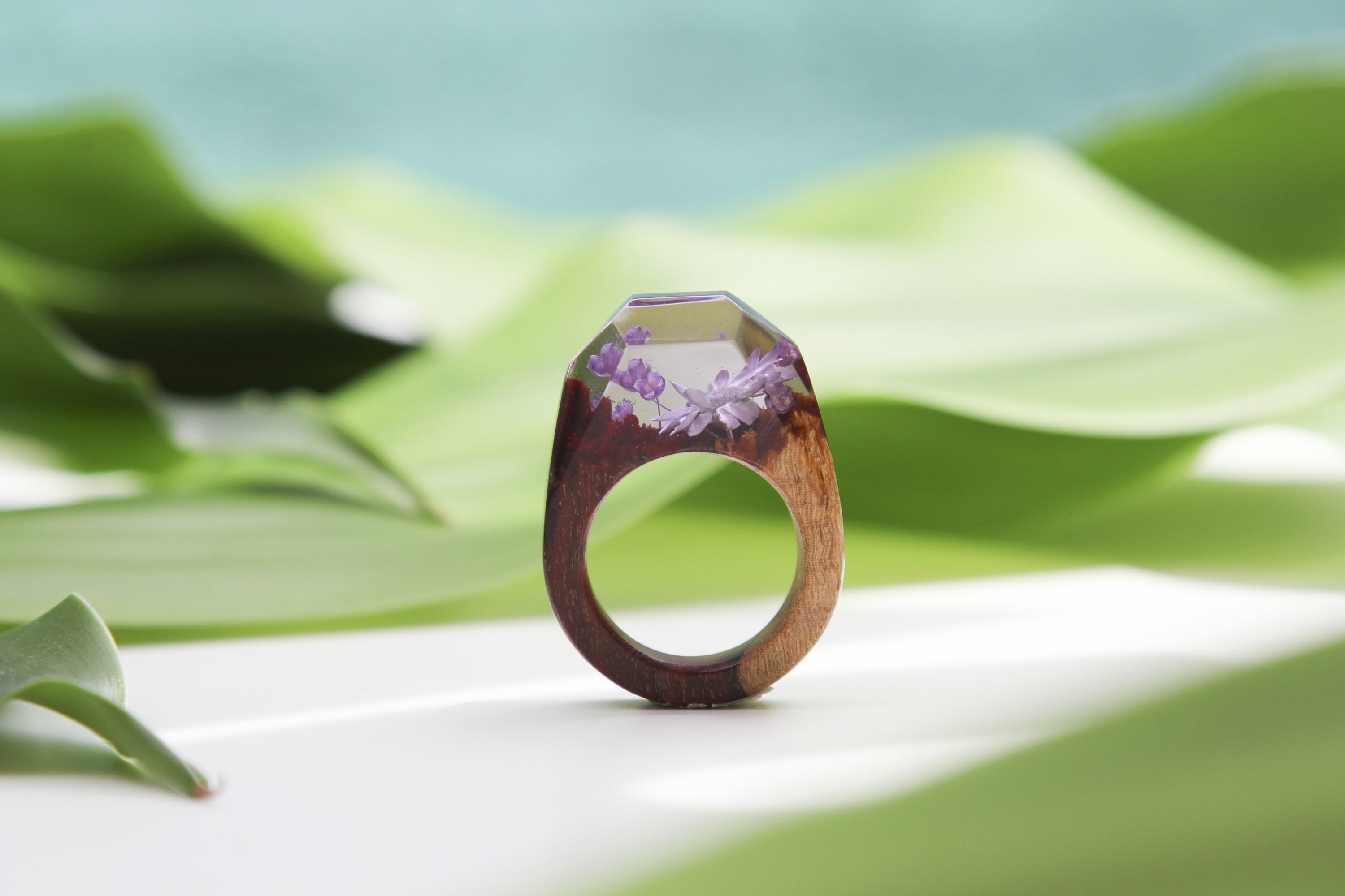 This ring is made with a purple resin and a base of two toned rosewood which is both hard and resilient.