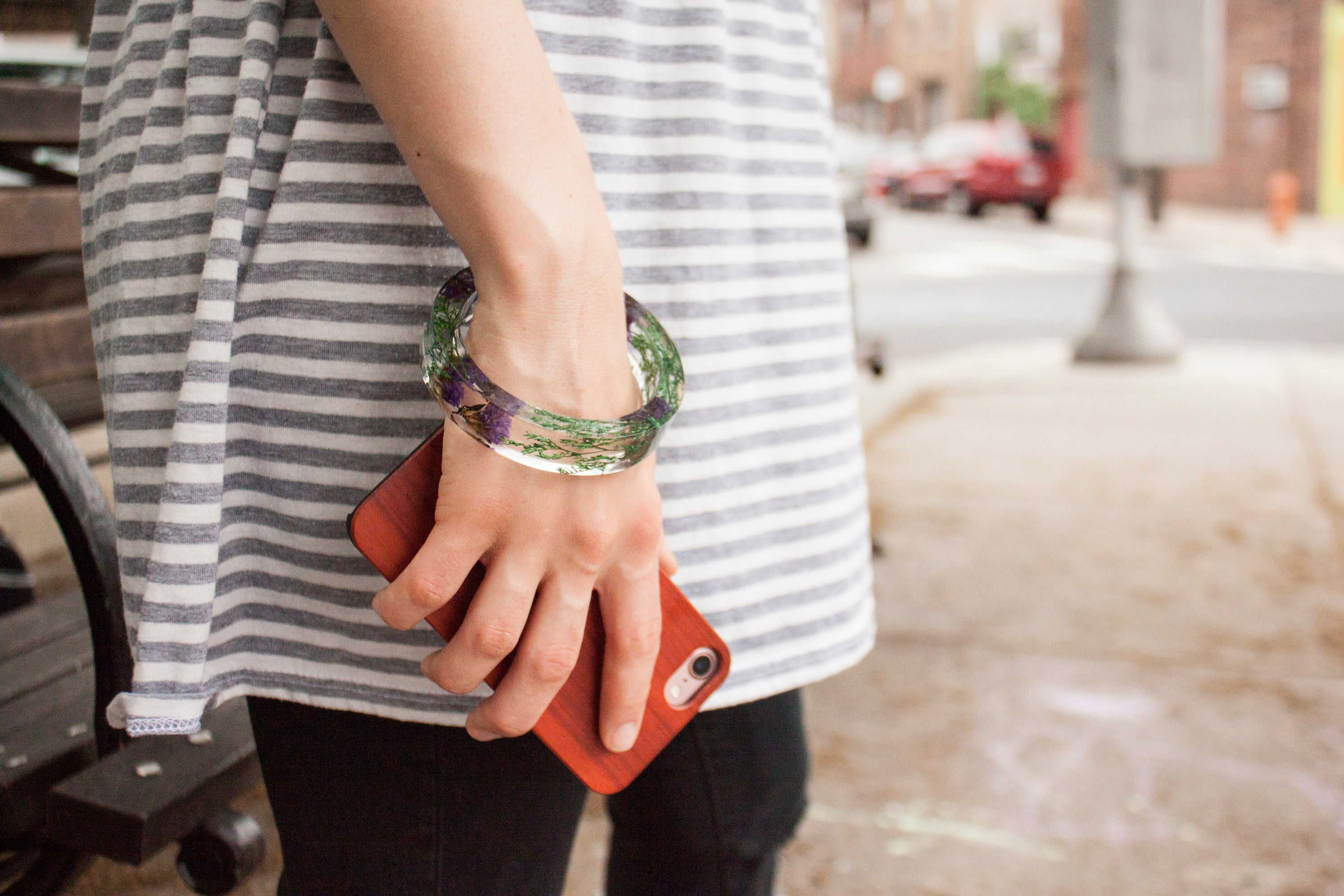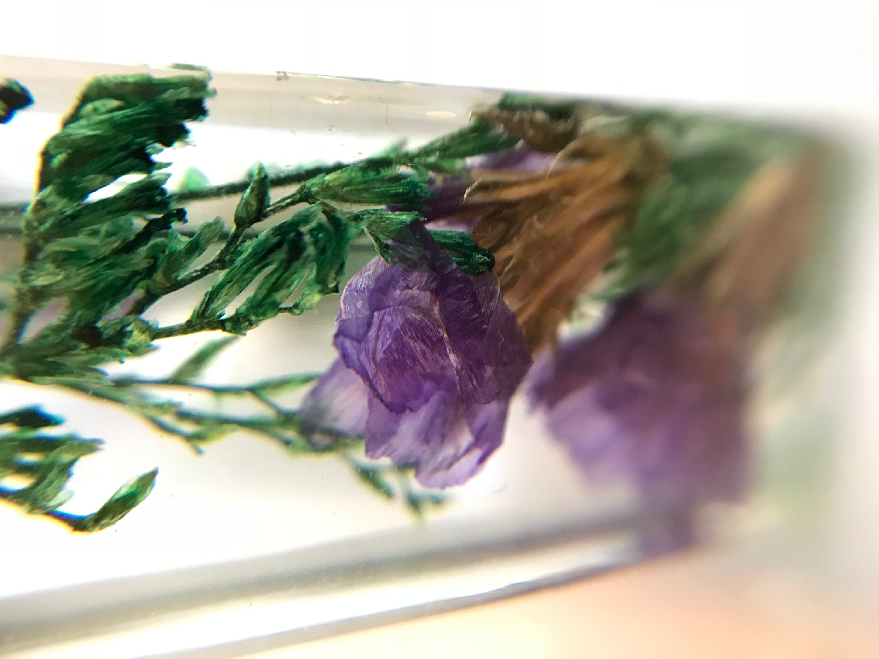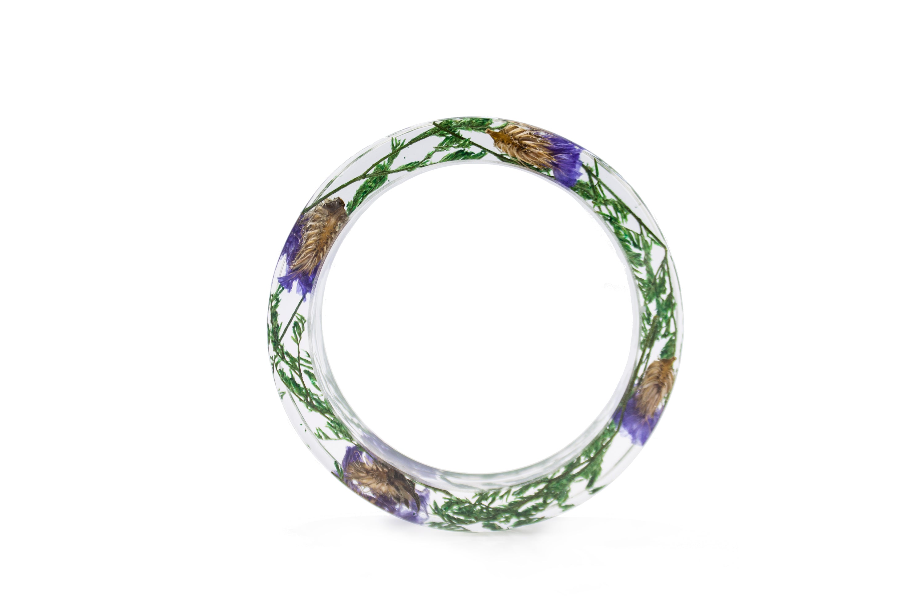 This cuff is made with purple statice and wild greens encased in clear resin, and featuring a modern, flat edge.